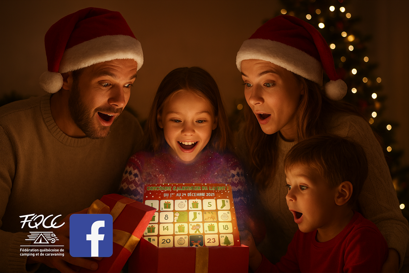 La FĂ©dĂ©ration quĂ©bĂ©coise de camping et de caravaning (FQCC), dont le siĂšge social est 1560 rue Eiffel #100, Boucherville, QuĂ©bec J4B 5Y1, organise du 29 novembre au 24 dĂ©cembre 2025 inclusivement un concours sur son compte Facebook sous forme dâappel Ă lâaction. Toute participation au concours au-delĂ de ce dĂ©lai ne sera pas prise en considĂ©ration. Â