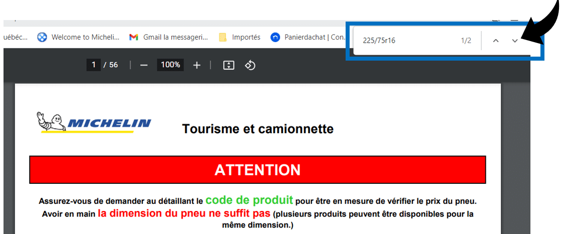 Une fois la liste de prix téléchargée, faites sur votre clavier les touches CRTL + F en simultané pour ouvrir une fenêtre de recherche. Inscrivez dans cette fenêtre le code de produit du pneu ou la dimension du pneu recherché et faites le bouton « Enter ». Pour les fins de cet exemple, j’utiliserai la dimension 225/75r16. Le résultat de la recherche affiché dans la fenêtre affiche 1/2 donc 1 produit disponible sur un total de 2 produits. Si tel est votre cas lors de la recherche et que plusieurs produits sont disponibles pour la même grandeur, cliquez sur les flèches de défilement pour naviguer dans la liste. Cela vous permettra de passer au produit suivant. Note : Seul le détaillant sera en mesure de vous confirmer lequel des produits disponibles est adapté et peut convenir pour votre véhicule.